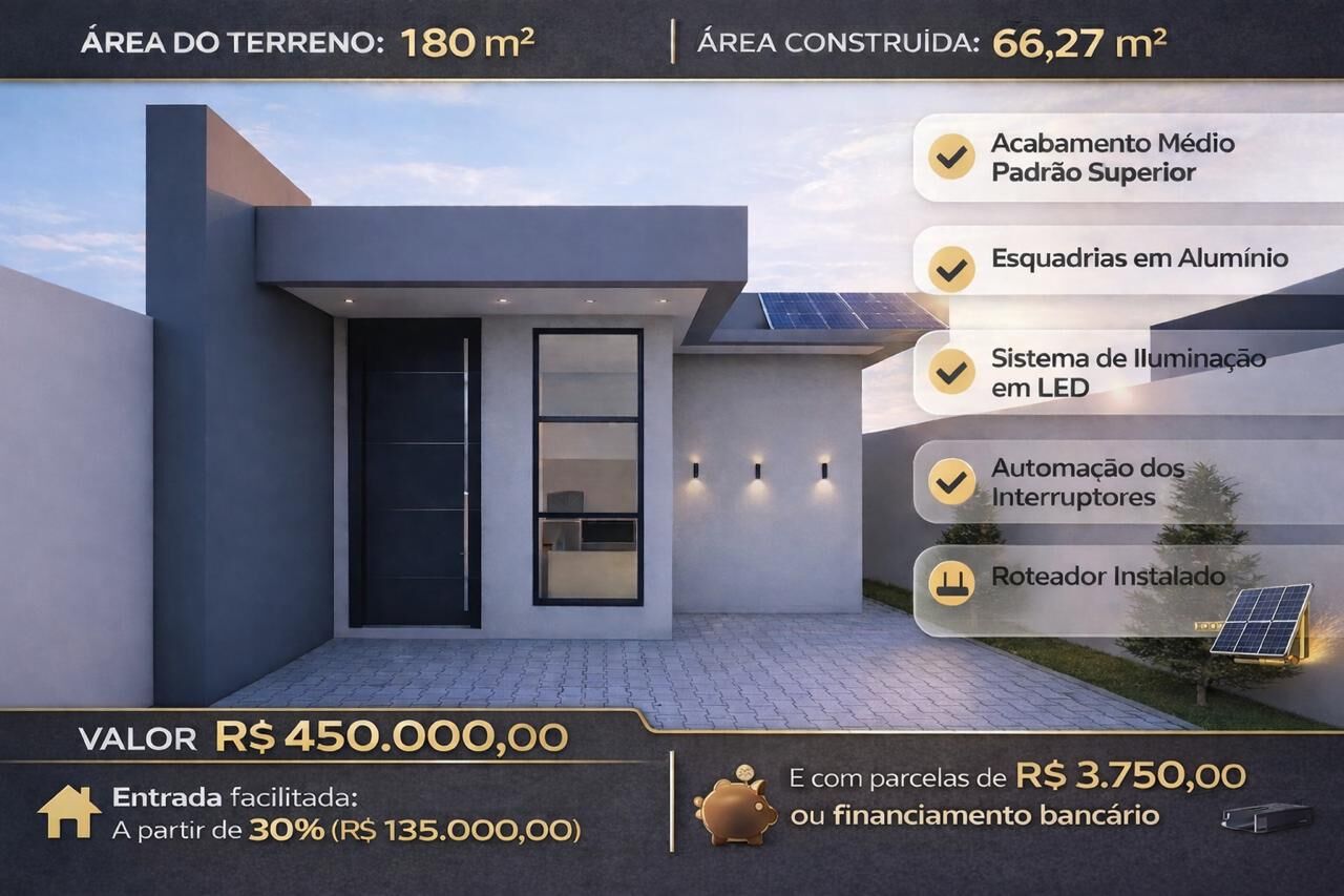 Com uma área construída de 66m², a casa conta com aquecimento solar e energia solar, pensando sempre na sustentabilidade e economia para você. Além disso, sua localização privilegiada próximo a escola, farmácia, padaria, praça, supermercado e transporte público, proporciona facilidade no dia a dia. Além disso, a casa possui sistema de iluminação em LED, automação dos interruptores, roteador de internet instalado e esquadria de alumínio.
